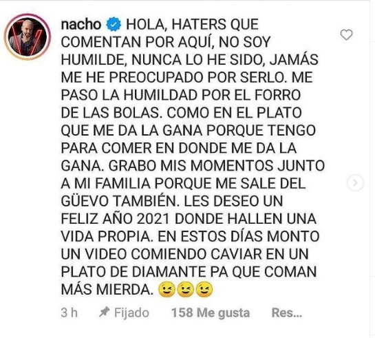 “Hola, haters que comentan por aquí. No soy humilde, nunca lo he sido, jamás me he preocupado por serlo. Me paso la humildad por el forro de las bolas. Como en el plato que me da la gana porque tengo para comer en donde me da la gana. Grabo mis momentos junto a mi familia porque me sale del güev0 también. Les deseo un feliz año 2021 donde hallen una vida propia. En estos días monto un video comiendo caviar en un plato de diamantes”.