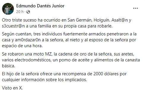 Este violento episodio ha provocado indignación en las redes sociales, donde varios usuarios han denunciado la creciente inseguridad que afecta a la sociedad cubana. Según Edmundo Dantés Junior, el hijo de la mujer, quien reside en Estados Unidos, ha ofrecido una recompensa de 2.000 dólares por cualquier información que conduzca a la captura de los implicados.