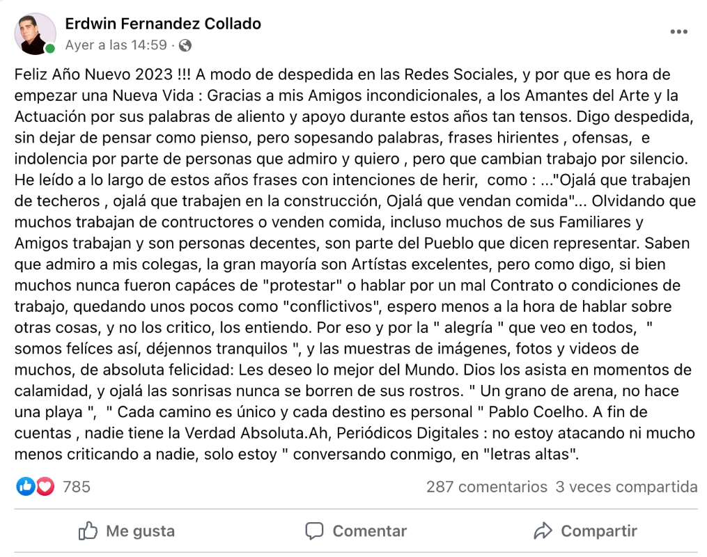 “Saben que admiro a mis colegas, la gran mayoría son Artistas excelentes, pero como digo, si bien muchos nunca fueron capaces de “protestar” o hablar por un mal Contrato o condiciones de trabajo, quedando unos pocos como “conflictivos”, espero menos a la hora de hablar sobre otras cosas, y no los critico, los entiendo”.