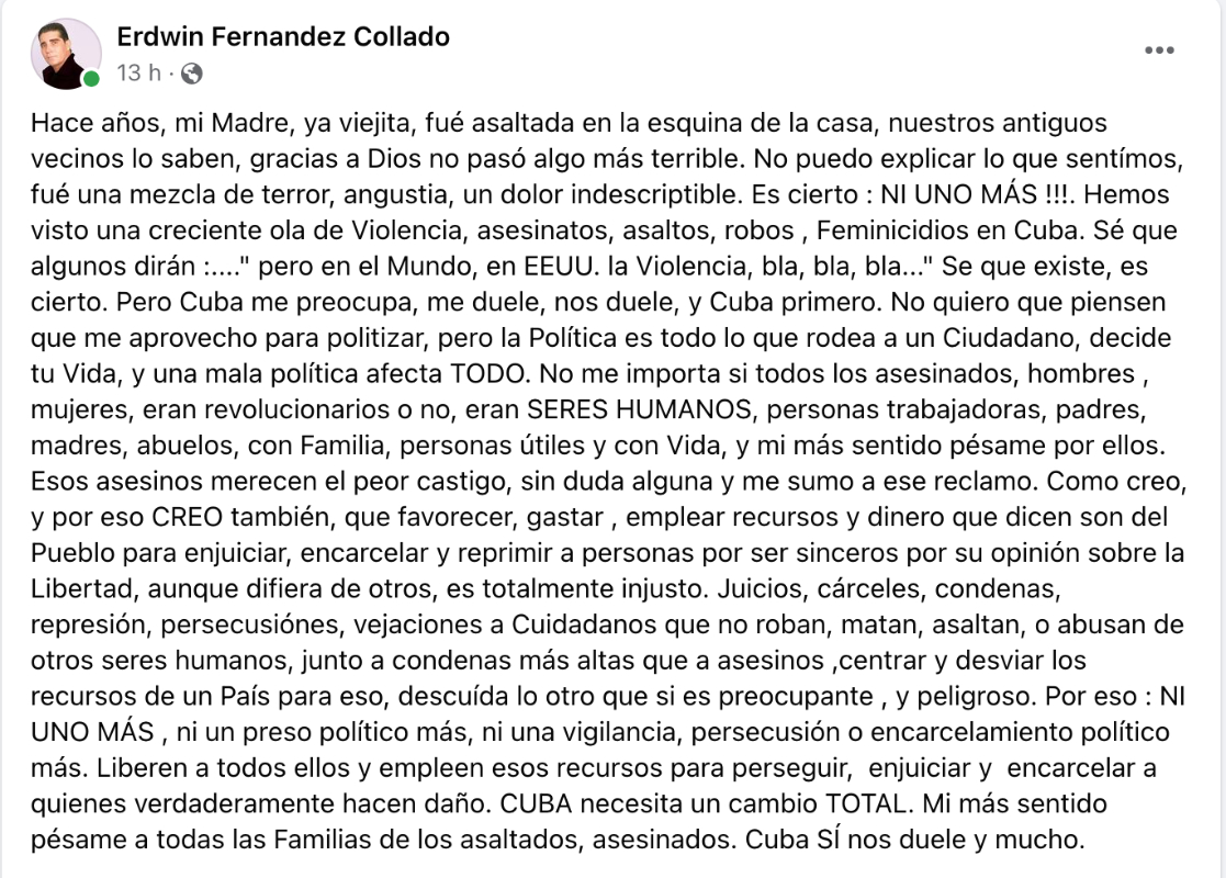 El actor cubano Erdwin Fernández ha reaccionado en Facebook ante la penosa situación: “Es cierto: NI UNO MÁS!!!. Hemos visto una creciente ola de Violencia, asesinatos, asaltos, robos, Feminicidios en Cuba. Sé que algunos dirán: “pero en el mundo, en EEUU, la violencia, bla, bla, bla…”Sé que existe, es cierto. Pero Cuba me preocupa, me duele, nos duele, y Cuba primero”.