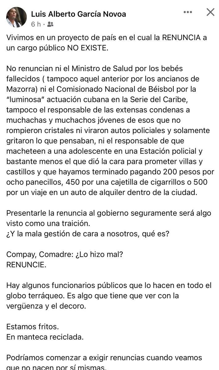 “Vivimos en un proyecto de país, en el cual la renuncia a un cargo público no existe”, aseguró el actor a través de su cuenta de Facebook. Así mismo, añadió que “No renuncian ni el ministro de Salud por los bebés ‘fallecidos’ (tampoco aquel anterior por los ancianos de Mazorra) ni el Comisionado Nacional de Béisbol por la ‘luminosa’ actuación cubana en la Serie del Caribe”, refiere en la publicación.