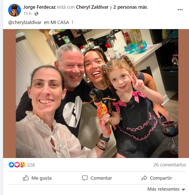 Zaldívar, a quien muchos compatriotas comparan con la fallecida actriz Broselianda Hernández, fue captada en una publicación del actor cubano Jorge Ferdecaz, residente en Miami desde hace varios años, donde compartió una entrañable foto familiar junto a la actriz, su hija Marina y su esposa Laura Marcos.
