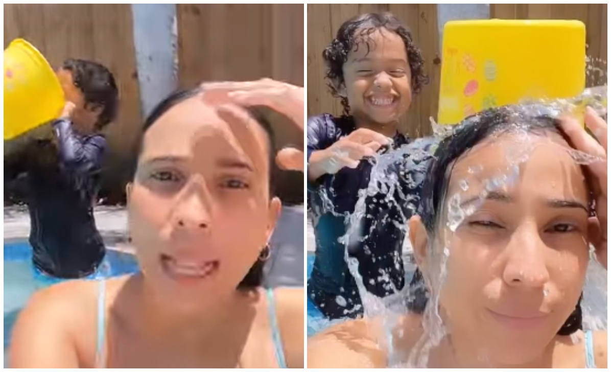 Pero detrás de ella se observaba al travieso Samuel jugando con cubo, el cual llenó con el agua de la piscina y comenzó a beberla. “No hagas eso”, se le escucha a Yuliet llamándole la atención, a lo que el niño reaccionó con carcajadas.