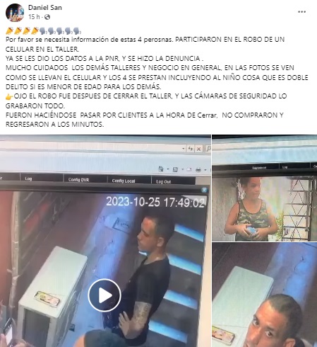 “Por favor, se necesita información de estas cuatro personas. Participaron en el robo de un celular en el taller. Ya se le dio los datos a la Policía Nacional Revolucionaria y se hizo la denuncia”, expresó San en su publicación, sin proporcionar detalles sobre la ubicación exacta del taller.