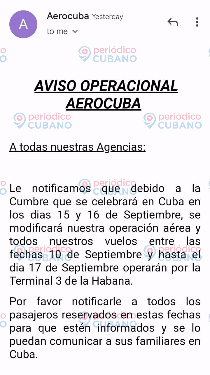 Asimismo, Aerocuba, una de las agencias de vuelos chárteres que comercializan rutas entre Estados Unidos y Cuba, recordó que, por el referido evento, programado para los días 15 y 16 de septiembre, se modificará la operación aérea. Todos los vuelos de este tipo fechados entre el 10 y 17 de septiembre operarán en la Terminal 3 del aeropuerto de La Habana.