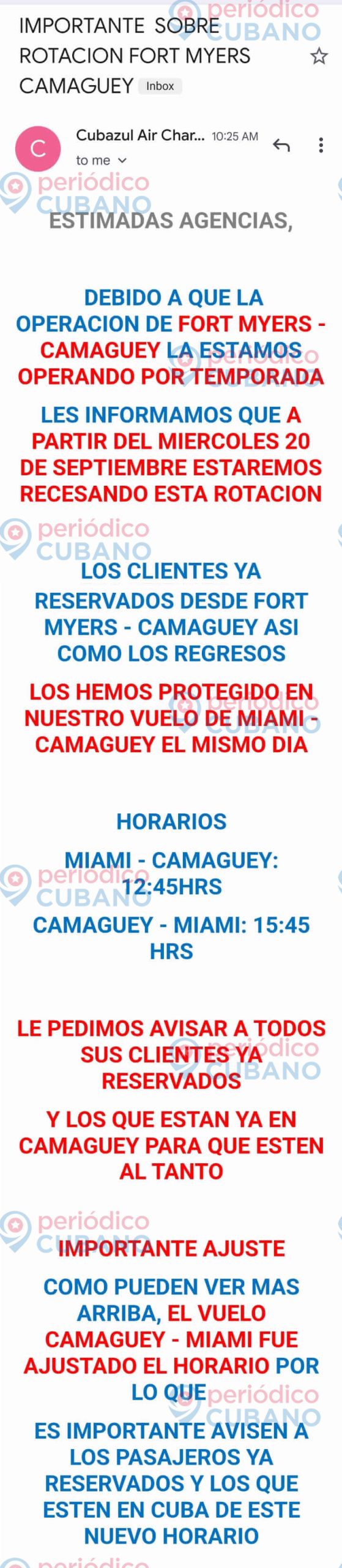 Cubazul informó que el próximo 20 de septiembre concluirá la temporada en la que suele operar vuelos en la ruta Fort Myers-Camagüey. Los clientes que reservaron este trayecto en ida y vuelta serán cubiertos con vuelos de Miami-Camagüey con los siguientes horarios:
