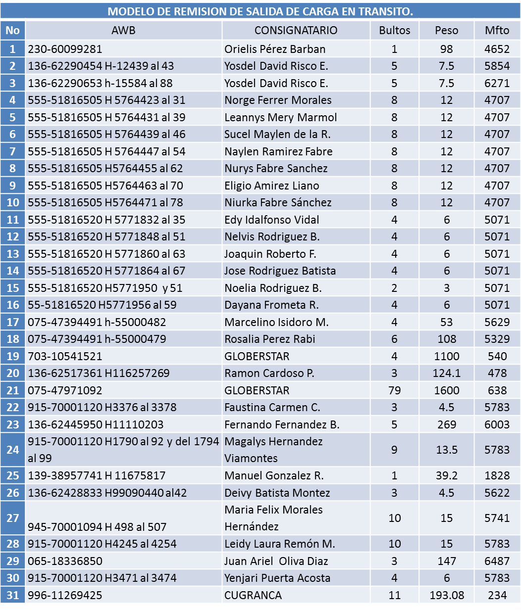 Aerovaradero, la empresa estatal responsable de buena parte de los envíos y cargas no acompañada enviadas a Cuba, reveló un listado con las guías de contenedores que tiene planificado despachar en los días finales del presente e mes de marzo.