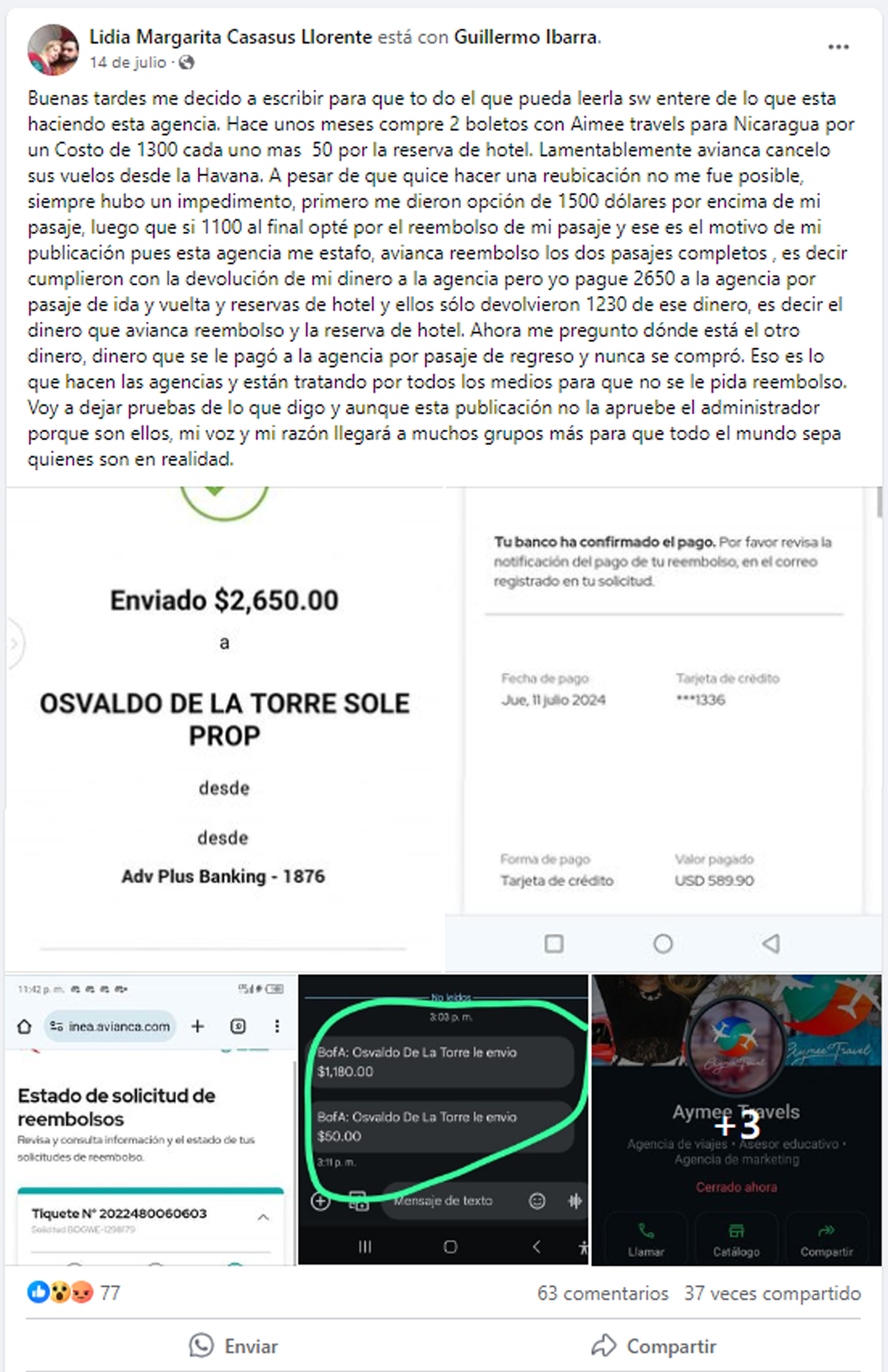 Periódico Cubano ha sido contactado por varios clientes de la agencia de viajes Aymee Travels, quienes aseguran haber sido víctimas de una estafa cuando le compraron varios tickets de viajes con destino final a Nicaragua.