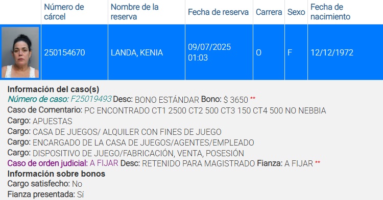 Las autoridades de Miami-Dade arrestaron a una cubana, identificada como Kenia Landa, de 52 años, por estar involucrada en una sala de juego ilegal. La detención estuvo a cargo de agentes de la Oficina del Sheriff del condado.