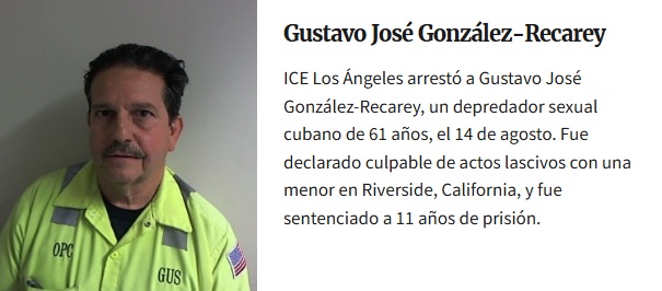 Los agentes del ICE detuvieron a González Recarey, de 61 años, en Los Ángeles, California. Este hombre fue condenado por actos lascivos contra una menor en Riverside y sentenciado a 11 años de prisión.