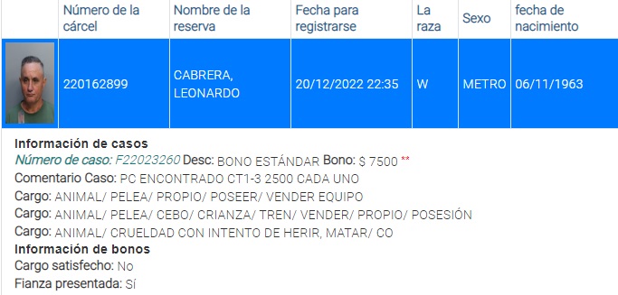 El presunto organizador de peleas de gallo permanece detenido en el Centro Correccional Turner Guilford Knight. Al sujeto le fijaron una fianza de 15.000 dólares para que lleve su proceso penal en libertad.