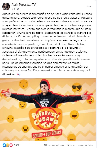 “Lo más interesante fue que anunció que convocaría a una protesta pacífica y que necesitaba el apoyo de los influencers cubanos. Bueno nos aparecimos sorpresivamente en su casa algunos de los que el decía que éramos un show como Luis Manuel y Esteban para llevar a cabo tal propuesta y salió que me iba a demandar por filmarlo cuando él vive de eso y le reclama al gobierno porque no lo dejan grabar en la calle”, escribió Alain en su Facebook explicando lo sucedido.