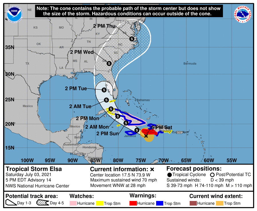 A las 5 de la tarde de este sábado la tormenta tropical Elsa se localizó en los 17.5 grados de latitud norte y los 73.9 grados de longitud oeste, mientras se mueve al oeste-noroeste cerca de 28 mph (44 km/h).