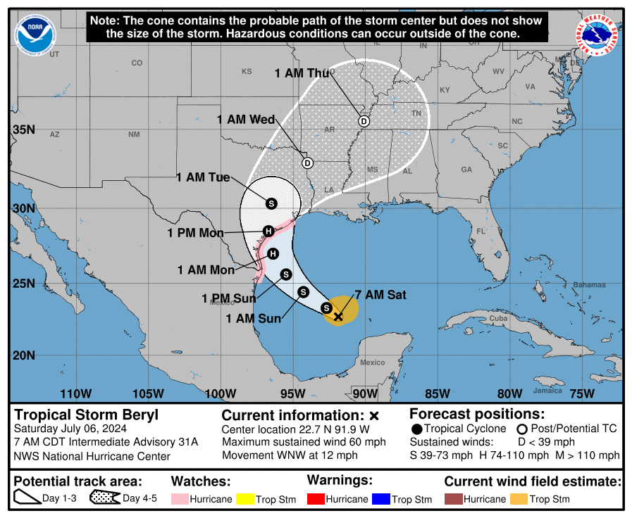 A las 7:00 a.m. del sábado 6 de julio, Beryl se encontraba cerca de la latitud 22.7 norte, longitud 91.9 oeste, moviéndose hacia el oeste-noroeste a unas 12 mph (19 km/h). Según los pronósticos, girará hacia el noroeste esta noche y luego hacia el norte-noroeste el domingo. La trayectoria proyecta que Beryl tocará tierra en Texas entre la tarde del domingo y la mañana del lunes.
