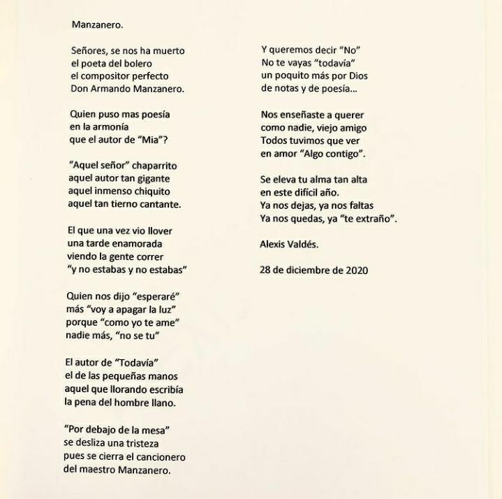 El actor y compositor cubano Alexis Valdés hizo un alto en sus quehaceres este lunes 28 de diciembre para escribir un poema a Armando Manzanero, a propósito de la triste noticia de su fallecimiento.