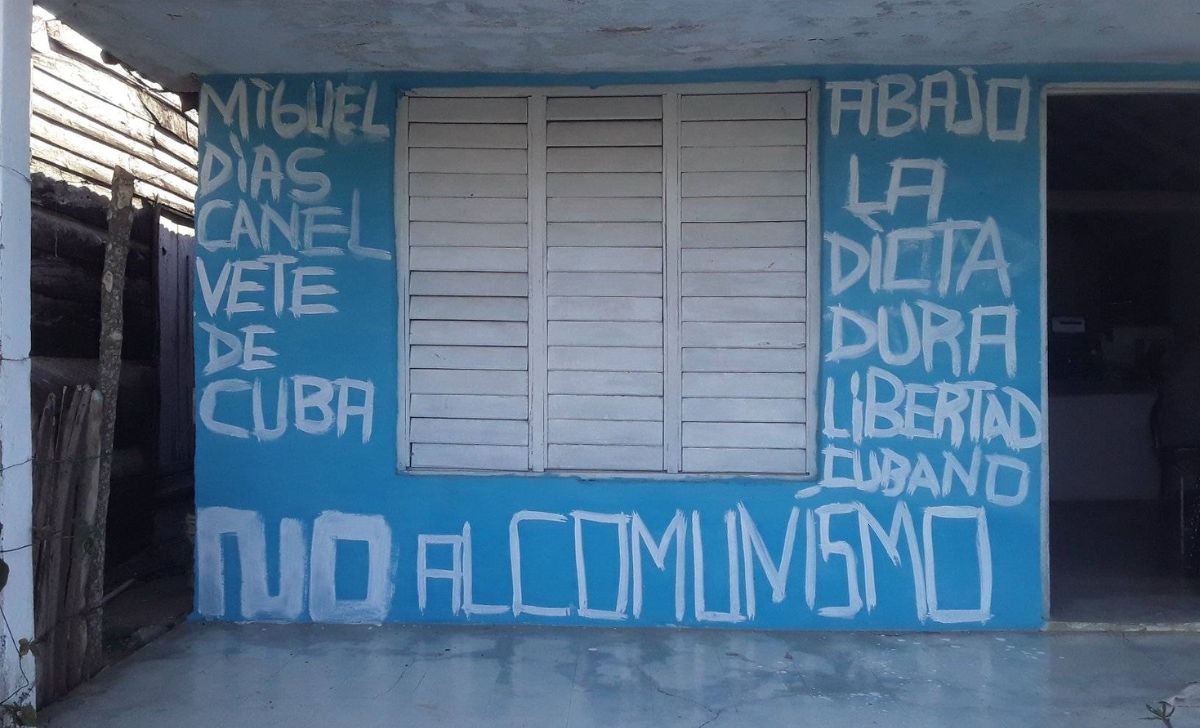 “No al comunismo cubano”, “Miguel Díaz-Canel, vete de Cuba”, “Libertad”, “Abajo la dictadura”, “No más hambre”, “No más apagón”, se lee en color blanco sobre la pared azul de la fachada de la casa.