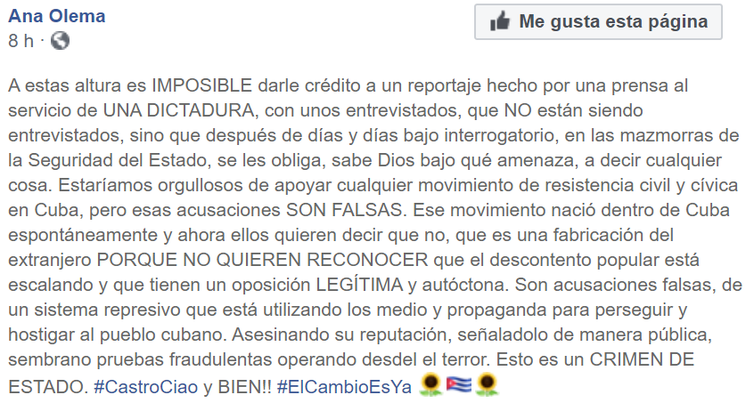 “A estas alturas es imposible darle crédito a un reportaje hecho por una prensa al servicio de una dictadura”, inició Olema su comentario en las redes sociales desacreditando todas las acusaciones en su contra.