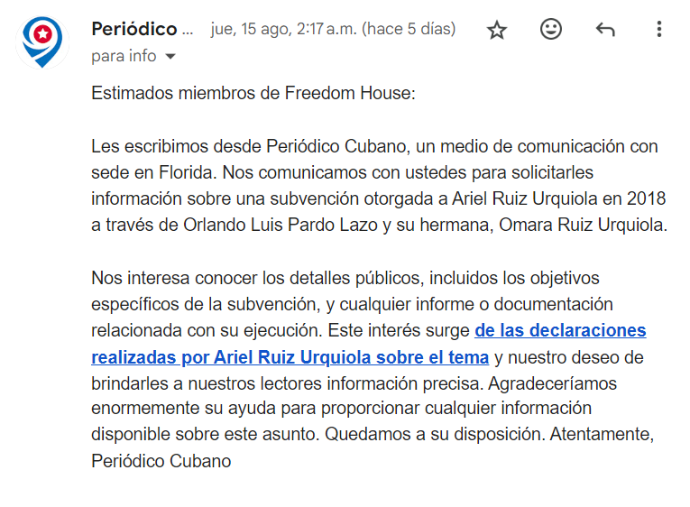 Periódico Cubano envió un email a la organización con sede en Washington D.C., a fin de conocer sobre el caso. El texto enviado y traducido al español es el siguiente.
