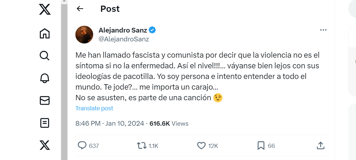 Sanz escribió en su publicación: “Me han llamado fascist* y comunista por decir que la violencia no es el síntoma, sino la enfermedad. ¡Así el nivel!!!… váyanse bien lejos con sus ideologías de pacotilla. Yo soy persona e intento entender a todo el mundo. ¿Te jod*?… me importa un caraj*…”. Sin embargo, el cantante añadió una nota intrigante: “No se asusten, es parte de una canción”, junto a un emoticono de una cara con gesto pillo.