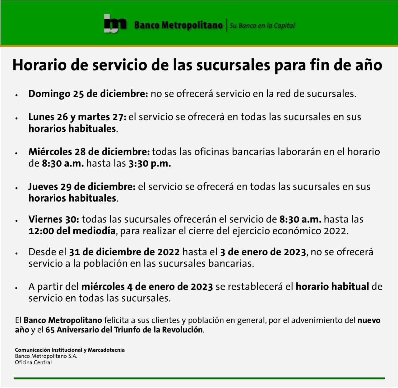 Durante la última semana laboral del año que comenzó este lunes 26 de diciembre, el Banco Metropolitano tendrá varios horarios dependiendo del día.