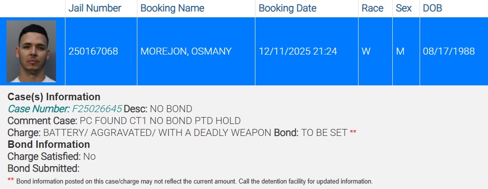 Morejón huyó del lugar tras el ataque, pero la víctima pudo identificarlo en una rueda de reconocimiento fotográfica realizada el 24 de noviembre. Sin embargo, el arresto se llevó a cabo hasta esta semana por el Equipo de Aprehensión de Delitos Graves del Departamento de Policía de Miami.