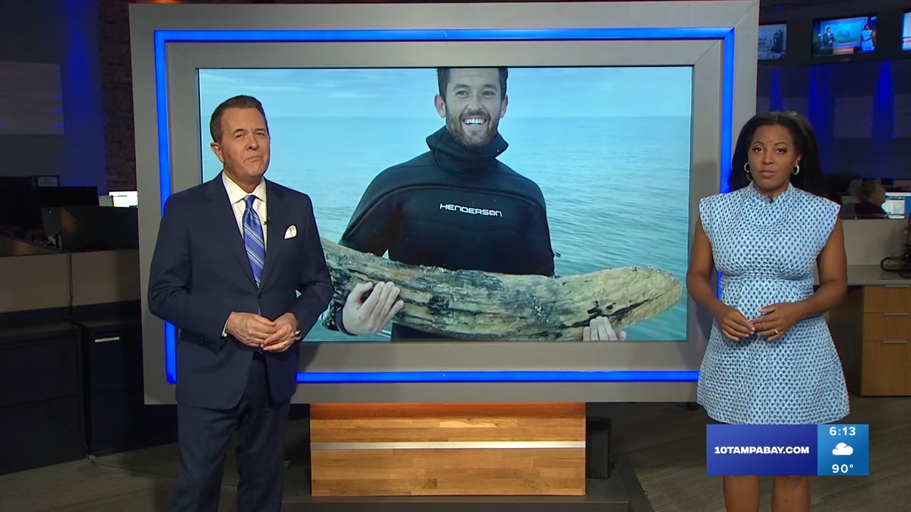 Alex Lundberg, un buzo de 29 años, descubrió un colmillo de mastodonte mientras se encontraba en aguas de Venice, condado de Sarasota. La pieza del prehistórico animal tiene una longitud de 4 pies (1.21 metros) y ahora se encuentran en la sala del apartamento de este joven en Tampa.