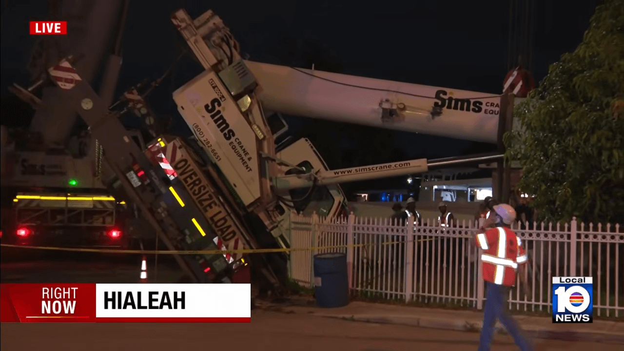 Una grúa de gran tamaño se desplomó este miércoles en un vecindario residencial de Hialeah, Florida, mientras un subcontratista de Florida Power & Light trabajaba en un poste de concreto, en un incidente que aterrorizó a los vecinos, rozó varias propiedades, pero afortunadamente no dejó heridos.