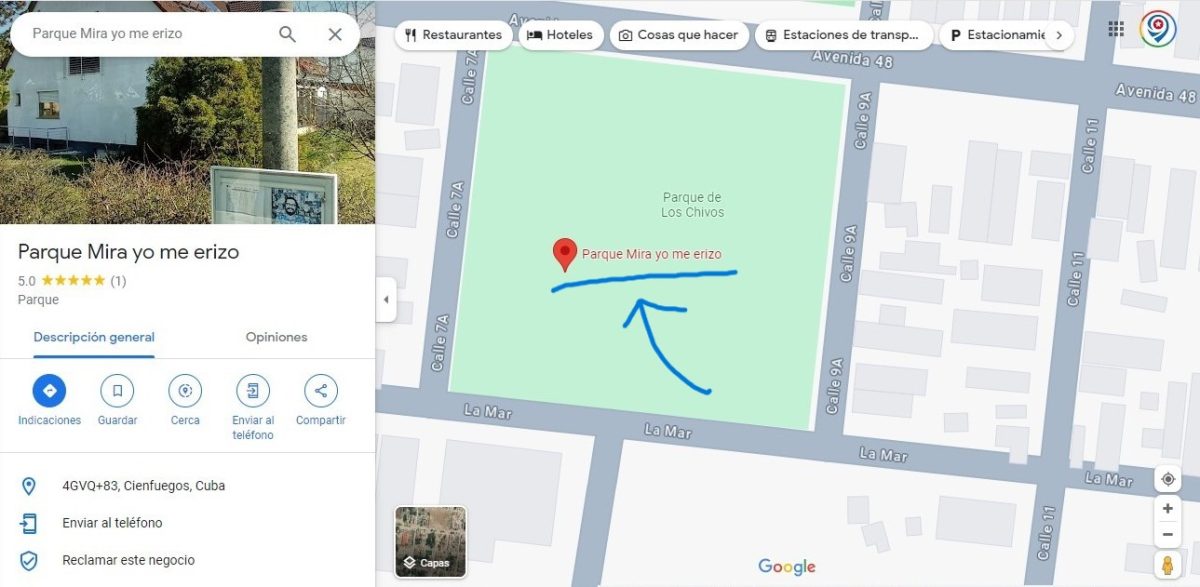 Periódico Cubano fue informado por uno de sus lectores que radica dentro de la Isla, y que pidió el anonimato; que luego de varias sugerencias de nombres a Google Maps, finalmente el nombre de Parque “Mira Yo Me Erizo”, había sido aceptado.