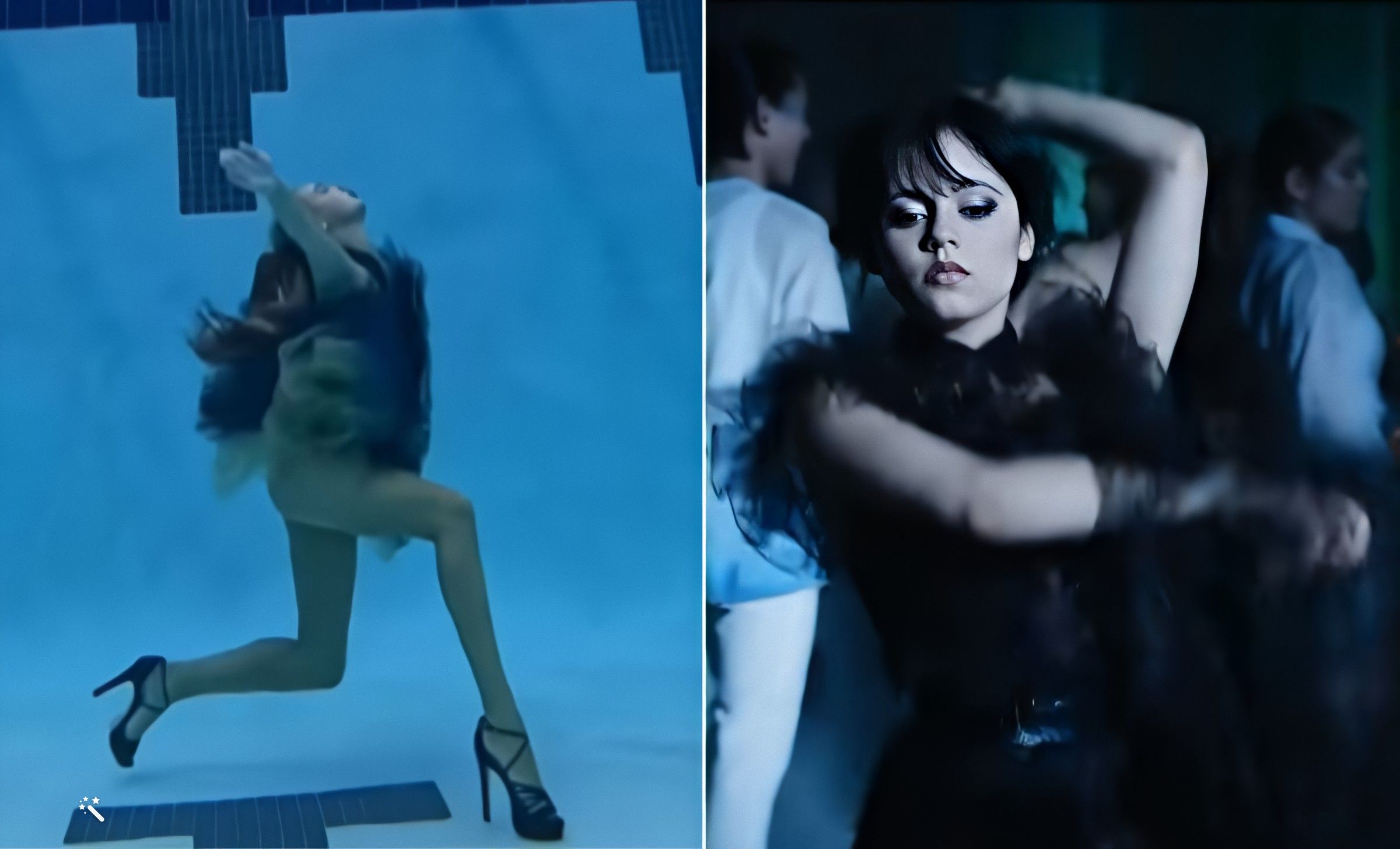 Desde el fondo de una piscina, la nadadora, luciendo un vestido corto y unos altos tacones, imitó los pasos de baile de la actriz Jenna Ortega, que da vida al personaje principal de la serie, la más reciente versión de la historia de la legendaria familia Addams.