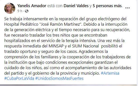 De ese escenario da fe la doctora Yanelis Amador, quien desde su perfil de Facebook publica que “debido a la interrupción de la generación eléctrica y el tiempo necesario para su recuperación, fue necesario trasladar los tres niños que se encontraban hospitalizados en el servicio de la terapia intensiva”.