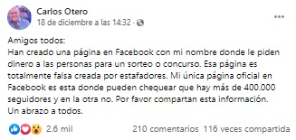 Otero también explicó han creado una página en Facebook con su nombre donde le piden dinero a las personas para un sorteo o concurso.