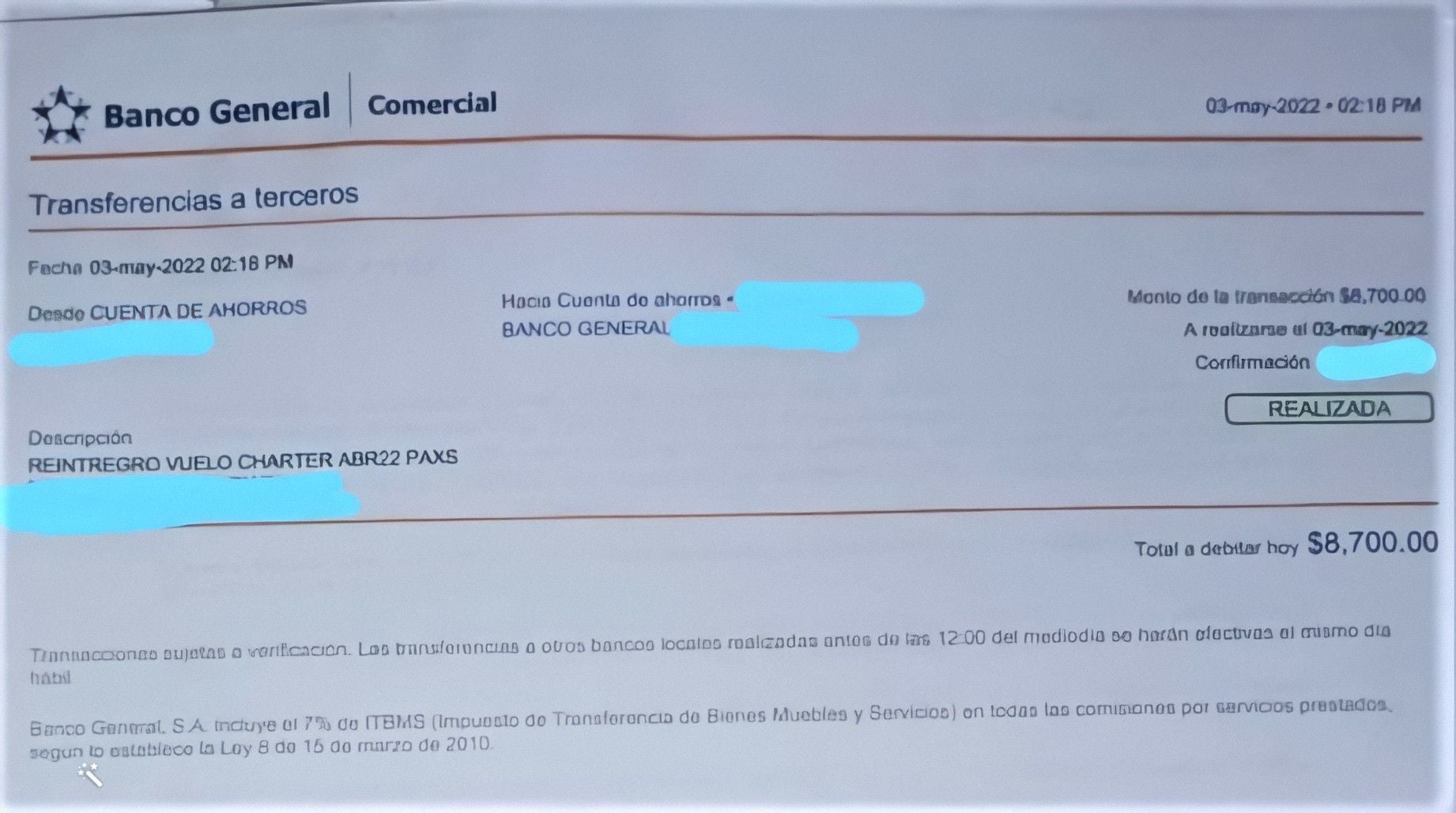 Además, dijeron que si contaba con una cuenta personal en Panamá lo depositaban el mismo día, tras lo cual fuimos al banco pues me tenían que depositar 9.000 dólares por los tres pasajes, finalmente recibí 8.700 por los impuestos, pero no me descontaron el ocho por ciento que decían.