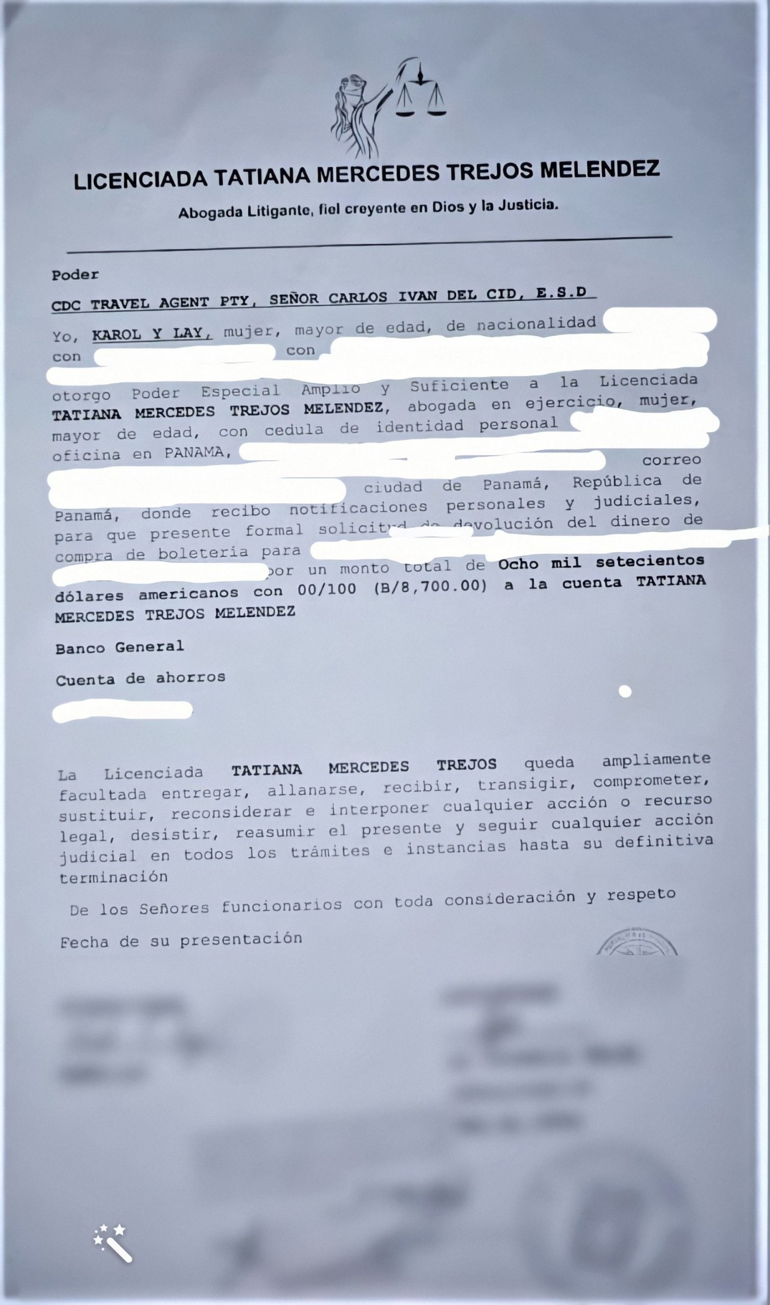 Mi decisión fue no discutir más nada con ellos, fui sin previo aviso con la Licenciada Trejos, quien les puso las cartas sobre la mesa y advirtió que tenían cinco días de calendario para devolver el dinero a la cuenta de la clienta, si no iniciaría procedimientos legales pues el contrato no tiene ninguna validez.