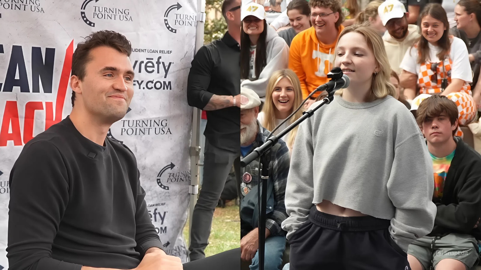 Jamás levantó la voz ni el puño durante sus debates. (Captura de pantalla © Charlie Kirk – YouTube)
