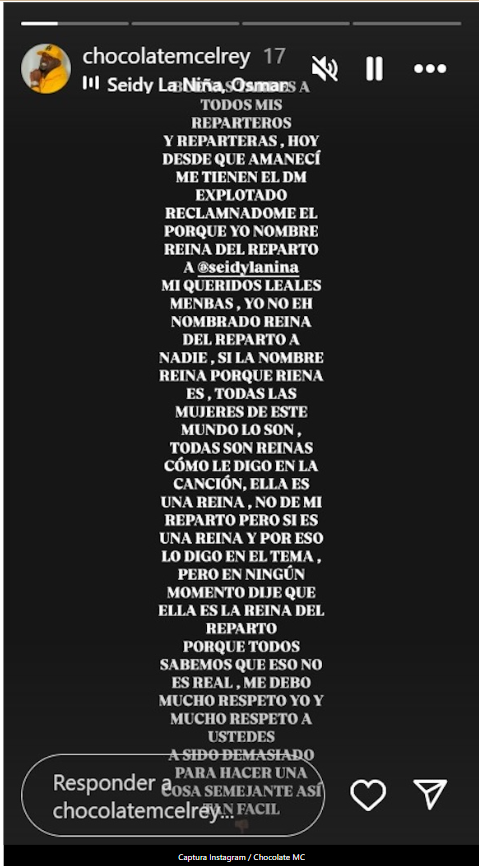 En respuesta, el artista aclaró en un post de Instagram que, aunque mencionó el concepto de “reina”, no se refería a Seidy como la “Reina del Reparto”, un título que ella ha usado en reiteradas ocasiones. “Mis queridos leales menbas, yo no he nombrado reina del reparto a nadie”, comenzó su mensaje Chocolate MC, refiriéndose a los seguidores que lo habían cuestionado por este asunto.
