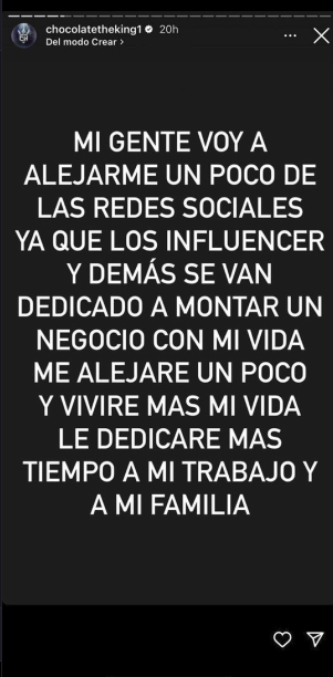 “Mi gente voy a alejarme un poco de las redes sociales, ya que los influencers y demás, que se han dedicado a montar un negocio con mi vida. Le dedicaré más tiempo a mi trabajo y a mi familia”, dijo el artista en una historia de Instagram repleta de faltas de ortografía.