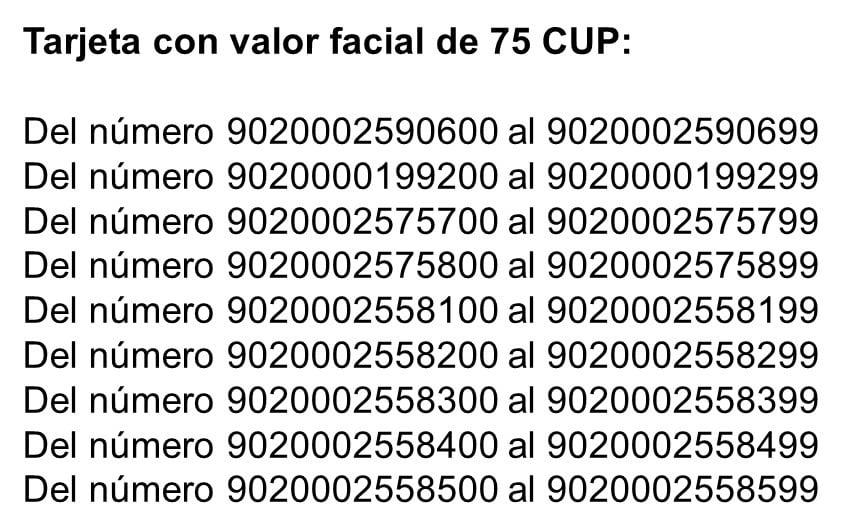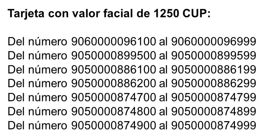 “Estamos comunicando a todos nuestros clientes, no adquirir fuera de los canales oficiales de venta informados por nuestra empresa en sus perfiles comunicacionales; en tanto las tarjetas relacionadas con este hecho, no podrán ser utilizadas”, dice el comunicado de Cimex que muestra una lista con los códigos de las tarjetas que son de todas las denominaciones, es decir, de 25, 75, 125, 500 y 1.250 CUP.