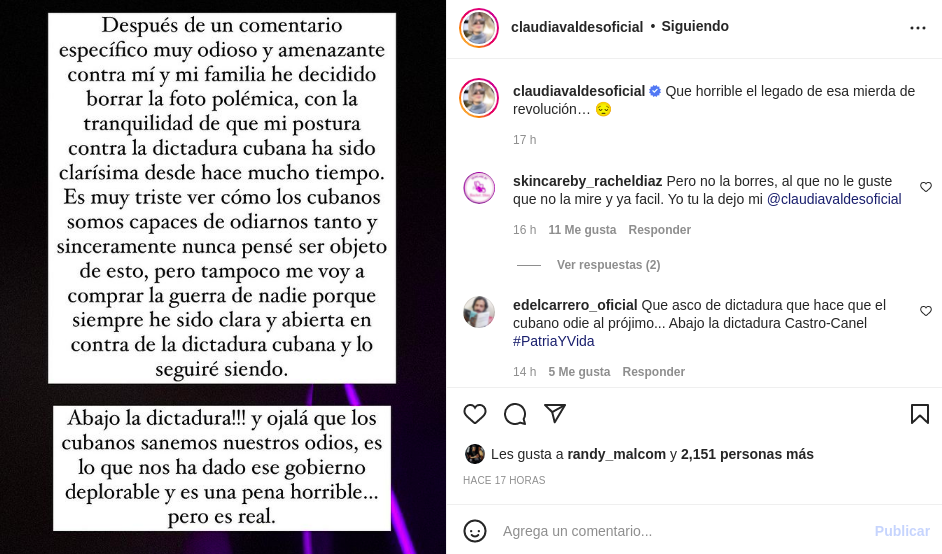 “Después de un comentario específico muy odioso y amenazante contra mí y mi familia he decidido borrar la foto polémica, con la tranquilidad de que mi postura contra la dictadura cubana ha sido clarísima desde hace mucho tiempo”, aseguró en su post.