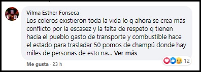 “Los coleros existieron toda la vida, lo que ahora se crea más conflicto por la escasez y la falta de respeto que tienen hacia el pueblo. Del gasto de transporte y combustible que hace el Estado para trasladar 50 pomos de champú donde hay miles de personas nadie habla. Yo estaba cerca y pude presenciar todo, estamos muy ignorantes y con vendas en los ojos. No vemos lo que está pasando realmente en Cuba y nos han puesto a todos repetir ‘culpa de los coleros’”, agregó otra.