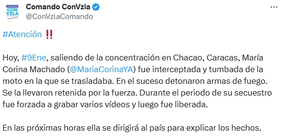 La plataforma opositora Comando con Venezuela confirmó la liberación de María Corina Machado, tras ser violentamente interceptada y secuestrada este jueves en el municipio de Chacao, Caracas.