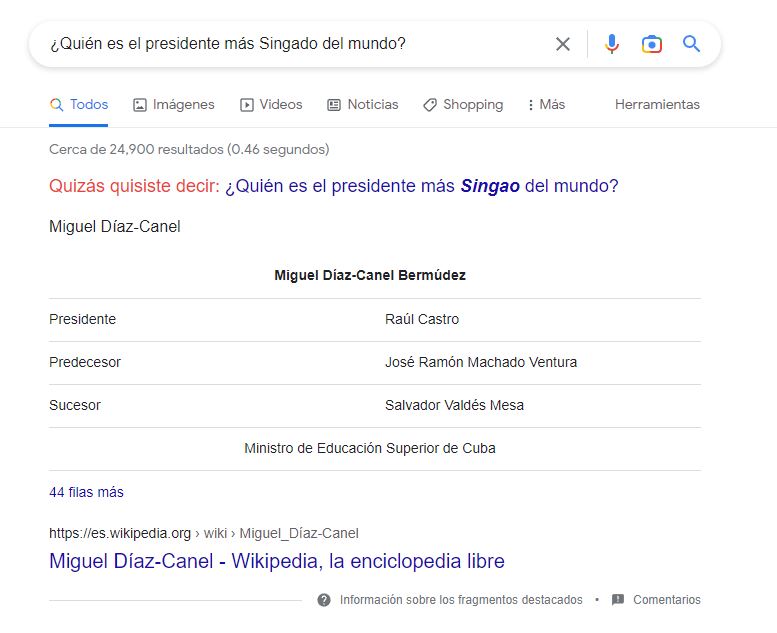 Si le preguntas a Google, ¿Quién es el presidente más Singado del mundo? El buscador sugiere de manera automática la ficha biográfica de Wikipedia de Díaz-Canel.