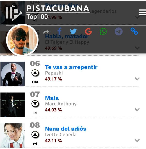 Asimismo, entre los 10 primeros lugares de la citada lista musical, de la autoría del cantante, figuró ‘Oye a mi corazón’. Actualmente, entre los 10 primeros lugares del Top 100 semanal, el cubano se enorgullece con el nuevo sencillo ‘Te vas a arrepentir’.