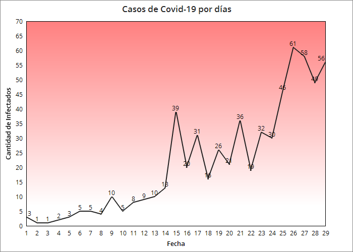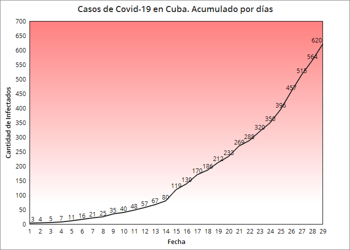 La cifra de casos confirmados por coronavirus en Cuba asciende a 56 durante las últimas 24 horas según informa el Ministerio de Salud Pública (Minsap). Con estas estadísticas el número de casos positivos es de 620 de los cuales 77 se han recuperado satisfactoriamente al tiempo que 17 personas han perdido la vida.