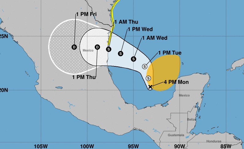 La trayectoria pronosticada indica que solo afectaría a territorio mexicano y una parte de Texas. Actualmente, el fenómeno se ubica a 195 kilómetros al nor-noroeste de la frontera con Tabasco y a 235 kilómetros de Ciudad del Carmen, Campeche.