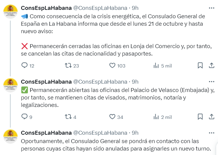 El 21 de octubre, el Consulado de España en La Habana había programado la atención de 326 personas adicionales por semana para trámites relacionados con la Ley de Memoria Democrática, lo que representaba un incremento del 37.33 % en la capacidad de procesamiento. Este plan quedó en suspenso debido a la crisis energética, complicando aún más el proceso para quienes buscan obtener la nacionalidad española, cuyo plazo cierra en exactamente un año.