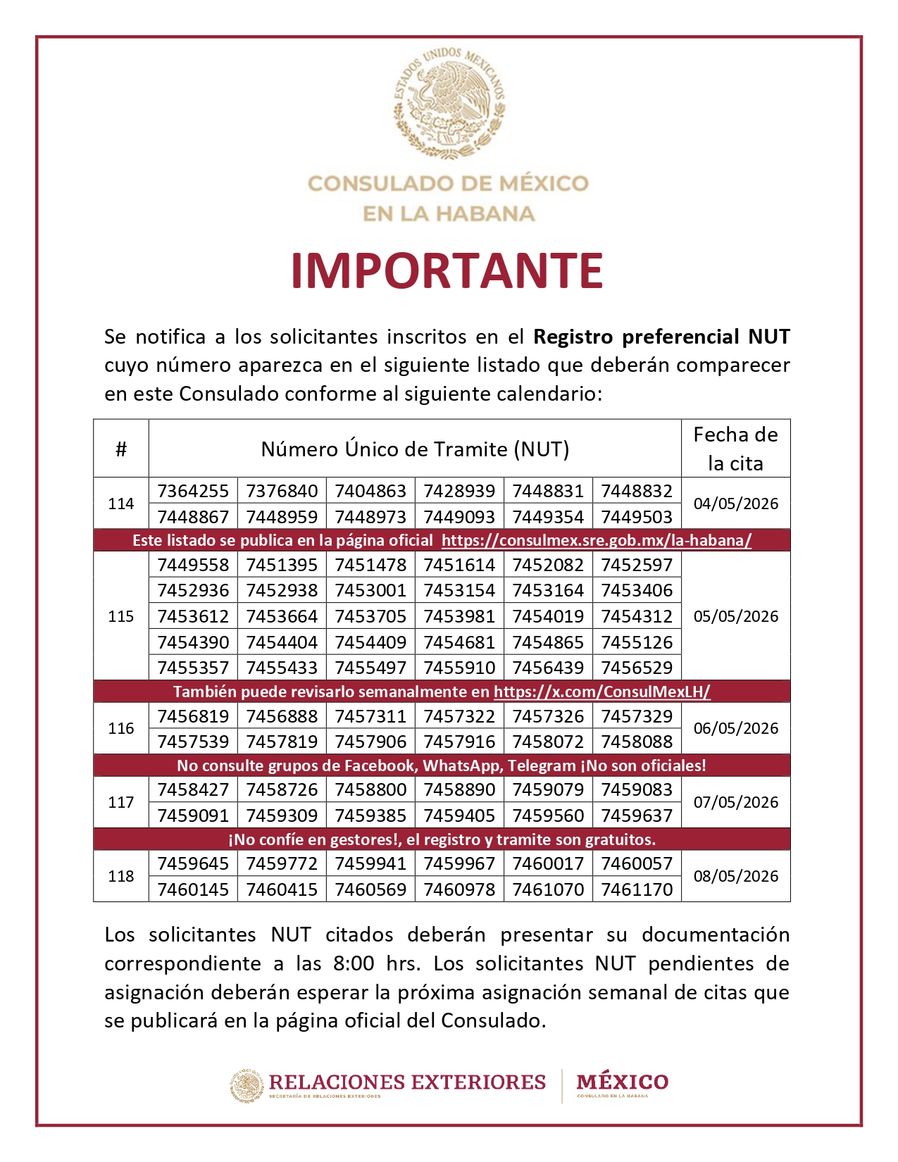 Según el aviso, las citas fueron distribuidas entre el 4 y el 8 de mayo de 2026. La organización se realizó por grupos identificados con números consecutivos, del 114 al 118, cada uno con decenas de códigos NUT asignados.