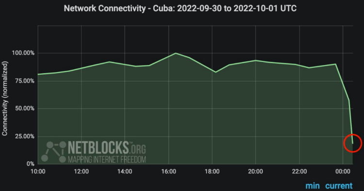 “Confirmado: Datos de red en tiempo real muestran corte de internet en #Cuba por segunda noche consecutiva; las métricas muestran un colapso en la conectividad después de las 8 p.m. hora local en medio de protestas por malas condiciones y cortes de luz agravados por el huracán Ian #CubaPaLaCalle”, publicó el sitio en su cuenta de Twitter.