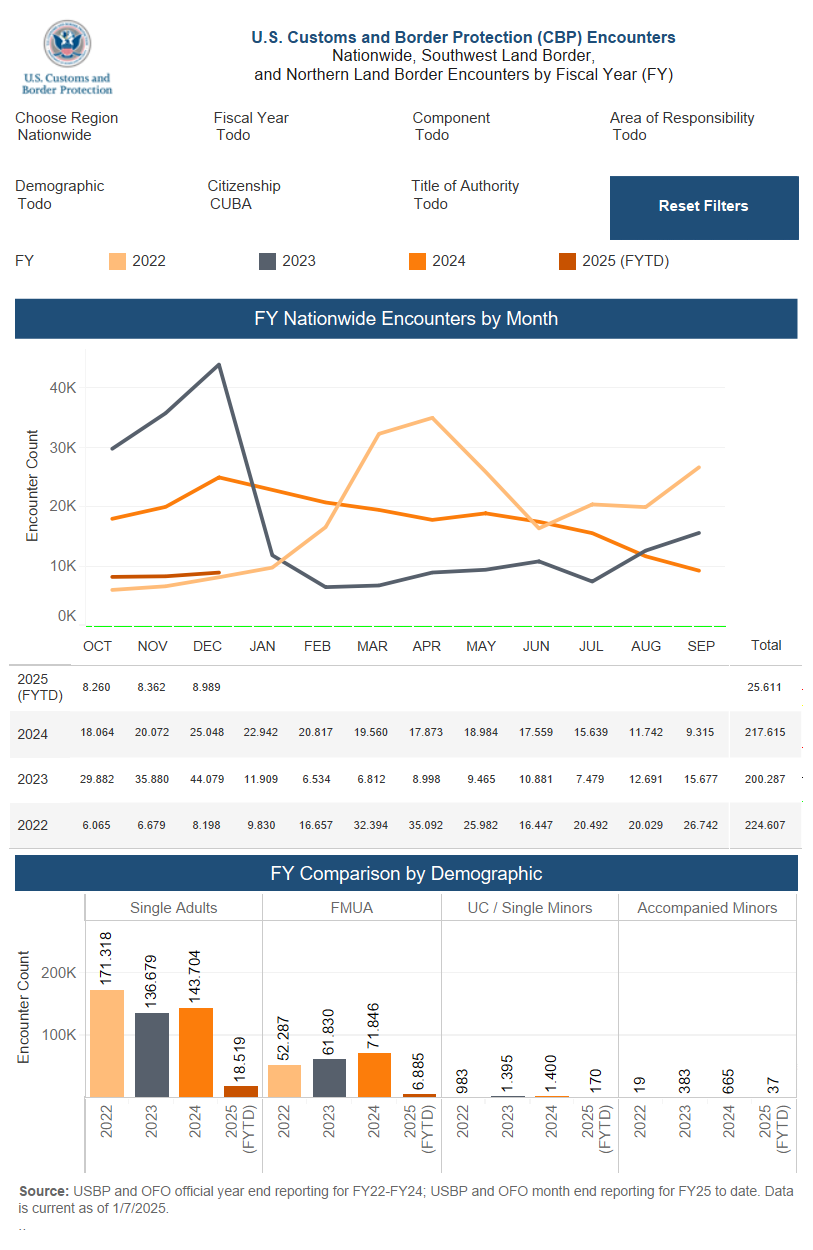 Desde la implementaci贸n de la Proclamaci贸n Presidencial sobre Seguridad Fronteriza en junio de 2024, las autoridades han reducido los cruces ilegales en m谩s del 60%. Sin embargo, estas restricciones no han detenido la llegada de cubanos, quienes est谩n utilizando procedimientos legales para ingresar al pa铆s.