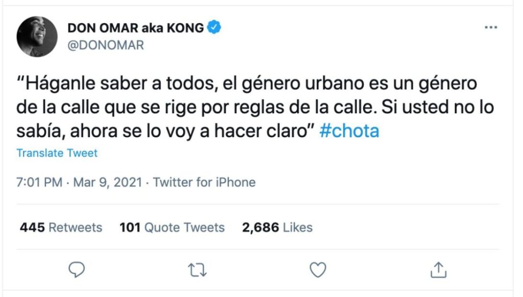 “Chota” es un término que en Puerto Rico se utiliza para referenciar a aquellas personas que han colaborado o colaboran dando información a la policía. Pina difundió un documento legal en el que asegura que si Don Omar no emite una retractación completa, acudirá a la Justicia de los Estados Unidos para demandarlo por difamación.