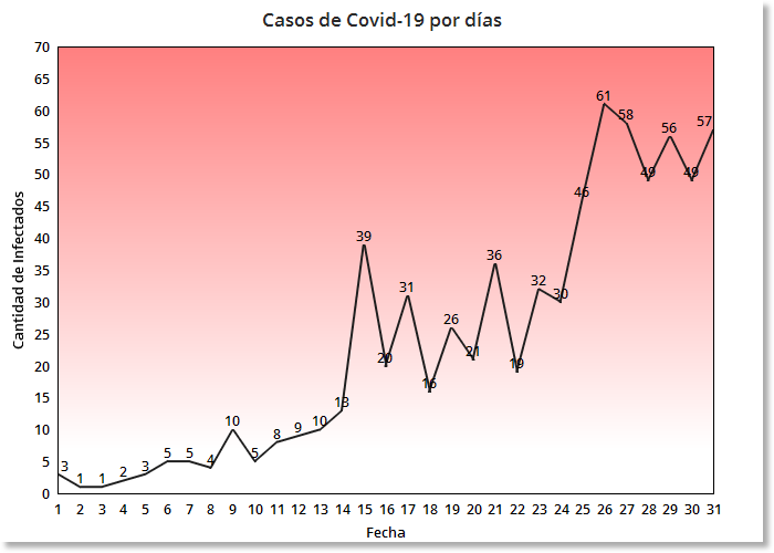 Para el Covid-19 se estudiaron 2 mil 76 casos, resultando positivas 57 muestras, con lo cual el acumulado es de 726 contagios, de los cuales hay 121 recuperados a más de un mes de los primeros casos reportados.